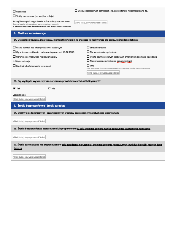 Następnie wskazujesz, jakie dane były objęte naruszeniem (np. dane kontaktowe, PESEL, dane zdrowotne) oraz kogo dotyczyło naruszenie (pracowników, klientów, pacjentów).